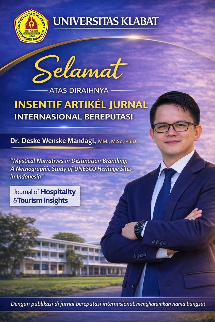 Penghargaan tersebut diberikan atas artikel ilmiah berjudul “Mystical Narratives in Destination Branding: A Netnographic Study of UNESCO Heritage Sites in Indonesia” yang dipublikasikan pada jurnal internasional bereputasi Journal of Hospitality and Tourism Insights. Artikel ini mengangkat kajian tentang peran narasi mistis dalam membangun citra destinasi pariwisata, khususnya pada situs warisan dunia UNESCO di Indonesia, dengan menggunakan pendekatan netnografi. Penelitian yang dilakukan Dr. Deske Mandagi tidak hanya memperkaya khazanah keilmuan di bidang pariwisata dan budaya, tetapi juga menunjukkan bagaimana kekuatan narasi lokal dapat dimanfaatkan sebagai strategi branding destinasi yang autentik dan berdaya saing global.