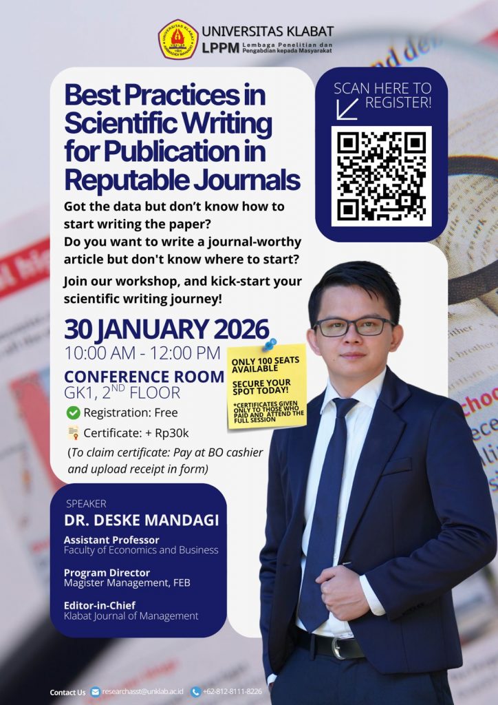 Lokakarya ini akan dibawakan oleh Dr. Deske Mandagi dan terbuka bagi mahasiswa, dosen, serta staf Universitas Klabat.